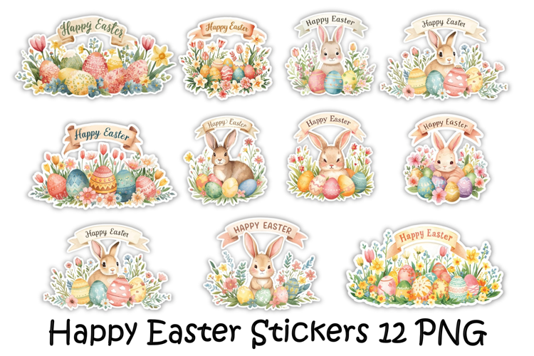 This set of 12 Happy Easter Bunny Stickers 4.They are ideal for making card designs, scrapbooks, journals, planners and stationary products and nursery items, The 12 files come in individual PNGs
