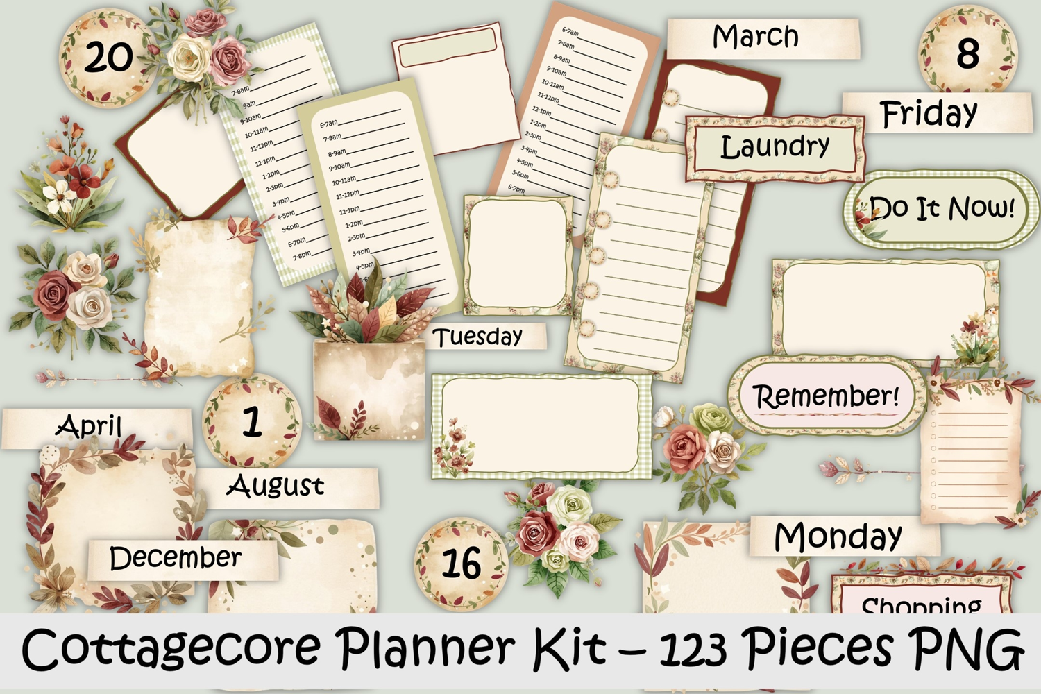 Unleash your creativity with this Cottage Themed Planner Kit, meticulously curated for those passionate about designing planners. This comprehensive kit incorporates all the essentials such as boxes, notelets, labels, lists both bullet and traditional ones, appointment strips, date tags for each day, decorative stickers, chic buttons, page borders and distinctly marked labels for weeks and months. Bringing your dreams to life, the array ensures a perfect planner design, while being easily customizable to match your unique style and requirements. All items are made available in high-resolution PNG format, offering you the liberty to resize them as per your necessities. To boost your creativity, we're throwing in three representative planner pages including daily, weekly, and monthly planners. With this full-fledged kit, you are set to transform your design ideas into an enchanting cottage-themed planner.