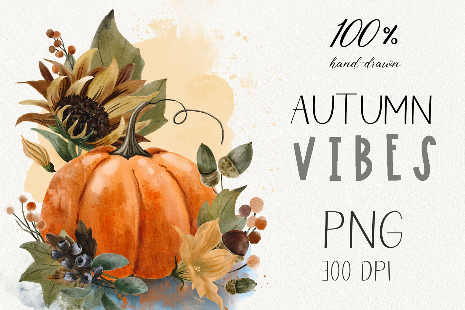 A hand-painted watercolor illustration featuring an orange pumpkin with sunflower, berries, acorns, and autumn leaves. Perfect for seasonal design projects such as greeting cards, packaging, wall art, fabric prints, and tableware. This handmade artwork captures the cozy charm of fall.