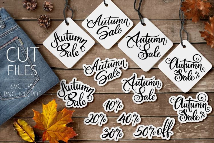 Introducing the charming fall stickers collection featuring "Autumn Sale" discounts of 10-20-30-40-50% off! These are a fantastic marketing idea to grab your buyer's attention. Perfect for sublimation prints or SVG cuts, these designs can be used for labels, shop window stickers, tags, cards, social media posts, wall designs, posters, and more.