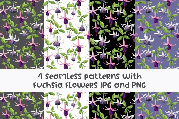 4 seamless patterns with fuchsia flowers sublimation jpg and png