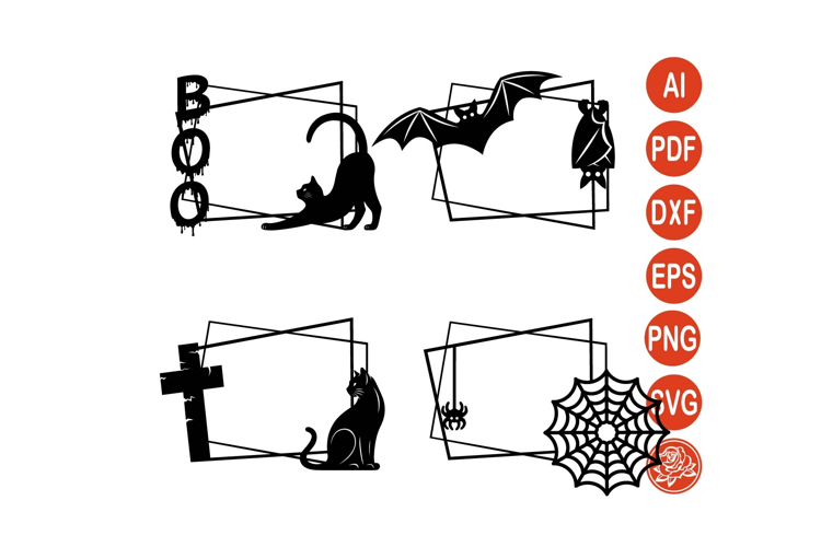 Get ready for Halloween with this versatile Halloween Frame SVG Bundle! This set includes spooky frames with thin black line art featuring bats, ghosts, a black cat, a pumpkin, spider webs, a witch, and a gravestone, all isolated on a white background for easy use.