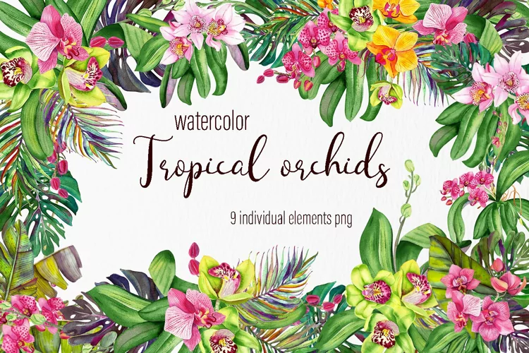 Watercolor Orchid compositions clip art. Tropical summer wedding flowers and leaves PNG. Tropical bouquet, border, arrangement.