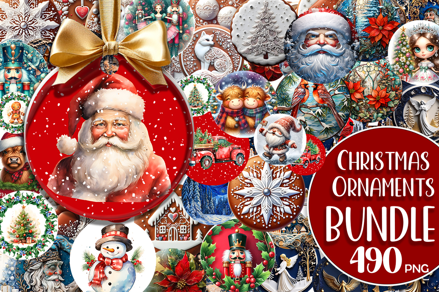 100 beautiful and cute Christmas sublimation ornaments: elves, trees, Santa Claus, red cars, snowmen, cookie people, birds, Stained glass and much more.