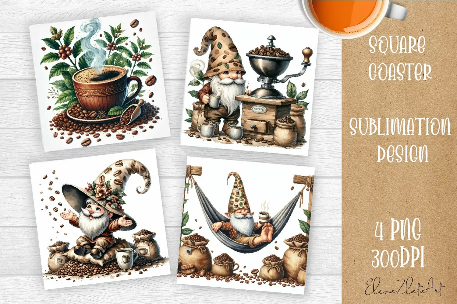 Coffee gnome | 4 square coaster sublimation designs