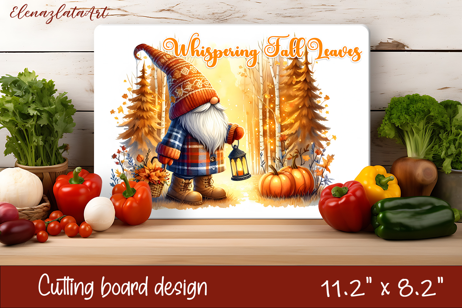 Gnome cutting board for Autumn, pumpkins, leaves