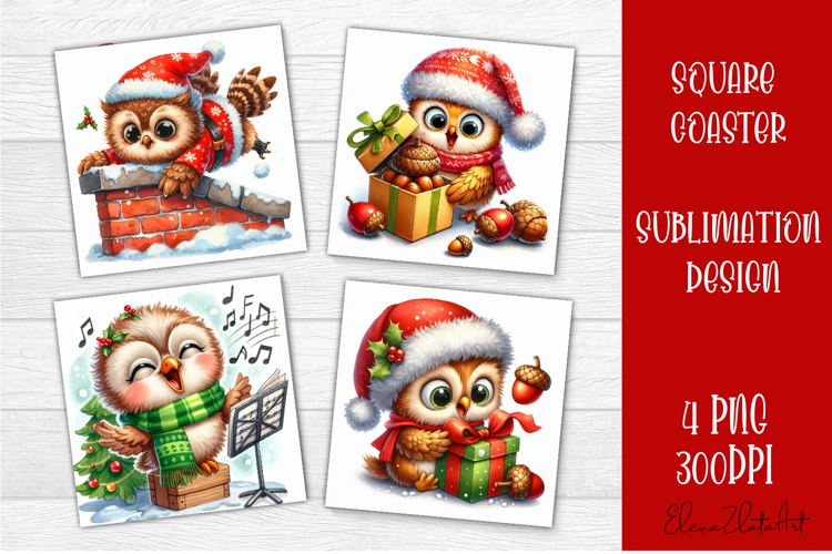 Funny christmas owl square coasters, Animals sublimation
