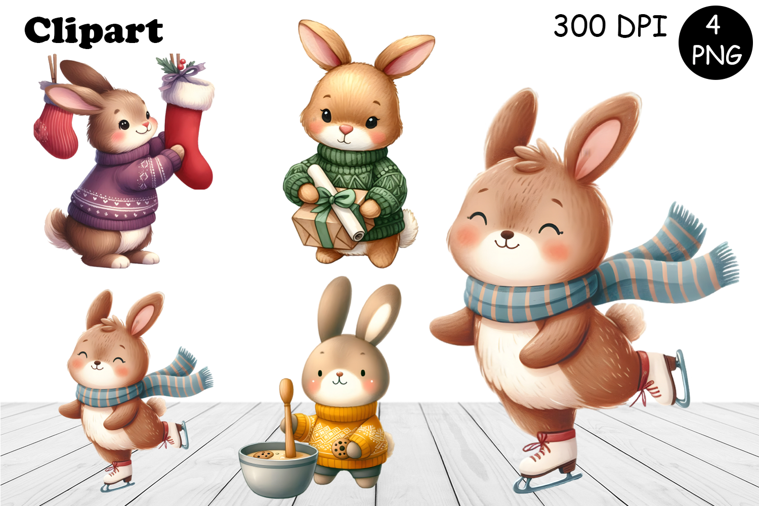 Christmas bunny animals winter Watercolor Clipart example image 1