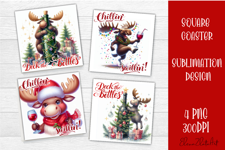 Christmas Animals Funny Christmas Coaster Sublimation Square Coaster Sublimation Christmas Square Coaster Tea Cup Square Coaster Funny Christmas Moose Wine Lover Christmas Coasters Funny Moose With Wine Png Cute Holiday Animal Png