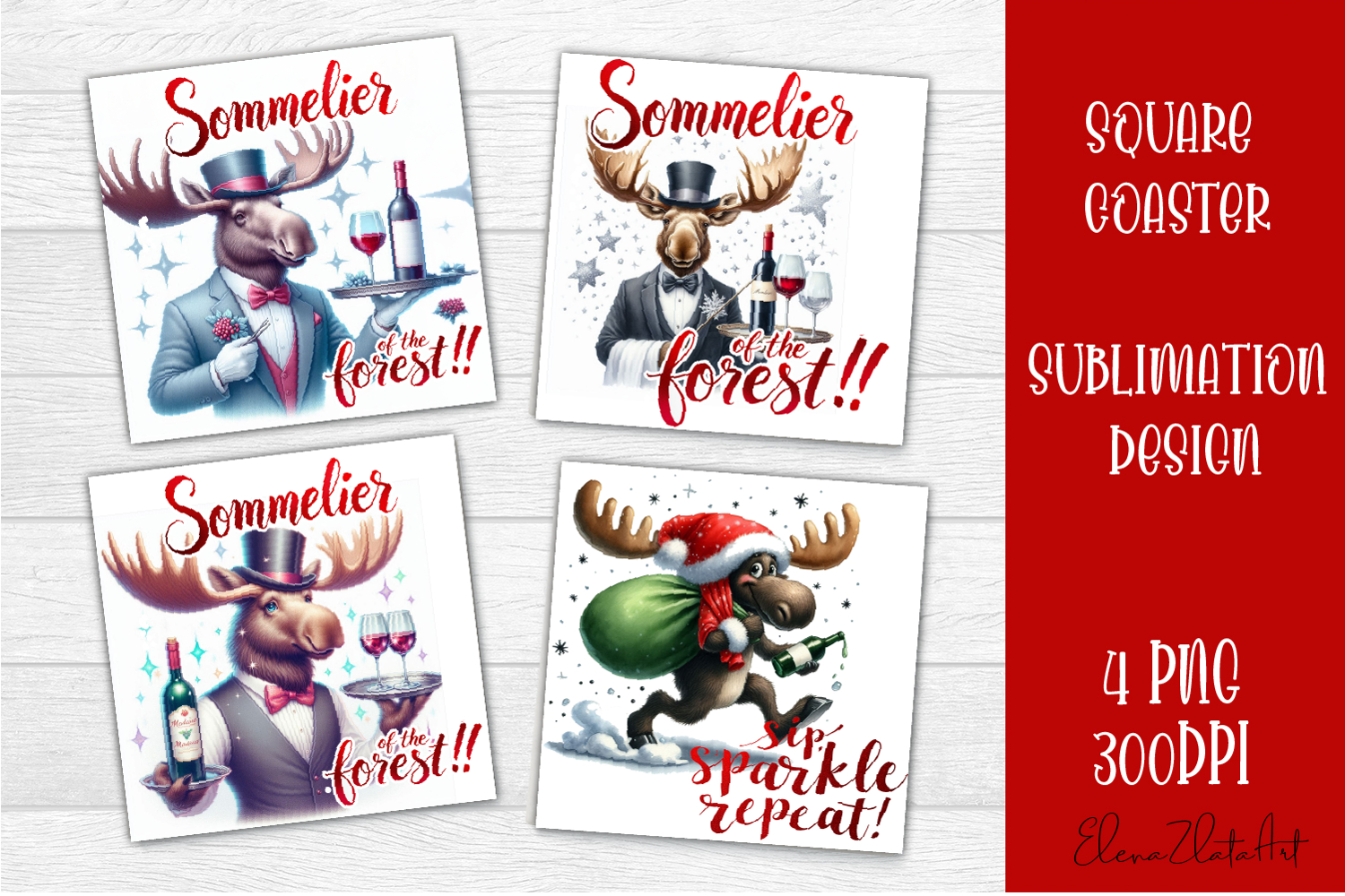 Wine Lover Christmas Coasters, Funny Moose with Wine PNG