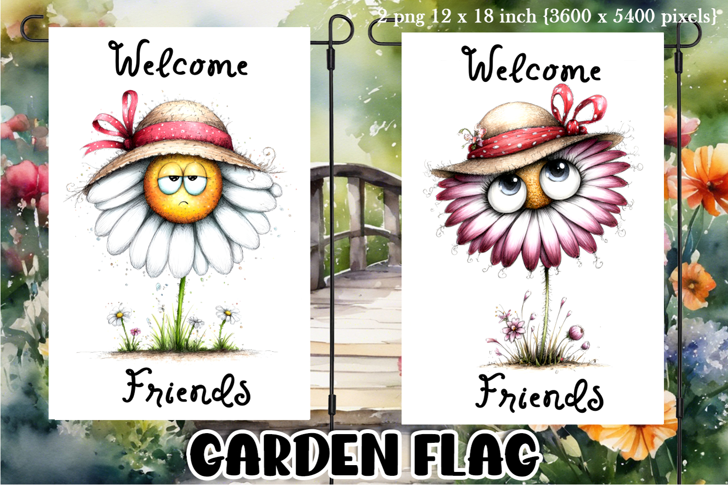 This bright and joyful Garden Greeting Flag Bundle features cheerful summer flowers with friendly expressions, perfect for decorating gardens, yards, patios, and walkways.