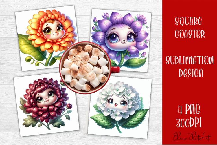 This bundle includes 4 cheerful floral designs created especially for square coaster sublimation. The playful characters bring warmth, personality, and a touch of whimsy to your home decor.
