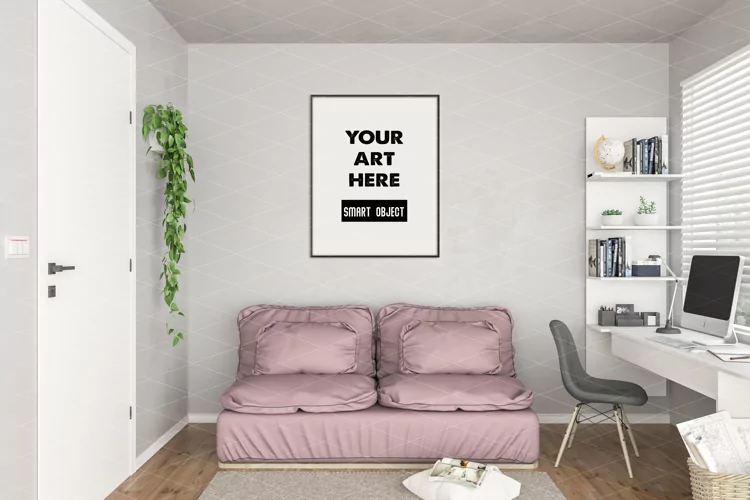 You like my interior scene but you don't use Photoshop and Photopea? No problem. This product is also for you. Use the included universal JPEG file. You can edit the JPEG file in any graphic design software working with layers. You only need to drag & drop your artwork image on the interior scene and the image adjust to your needs (resize, add inner shadows). You can use your own set of frames for this. Drag and drop the frame on the interior image - you can adjust the frame to your needs (resize as you like and add shadows).