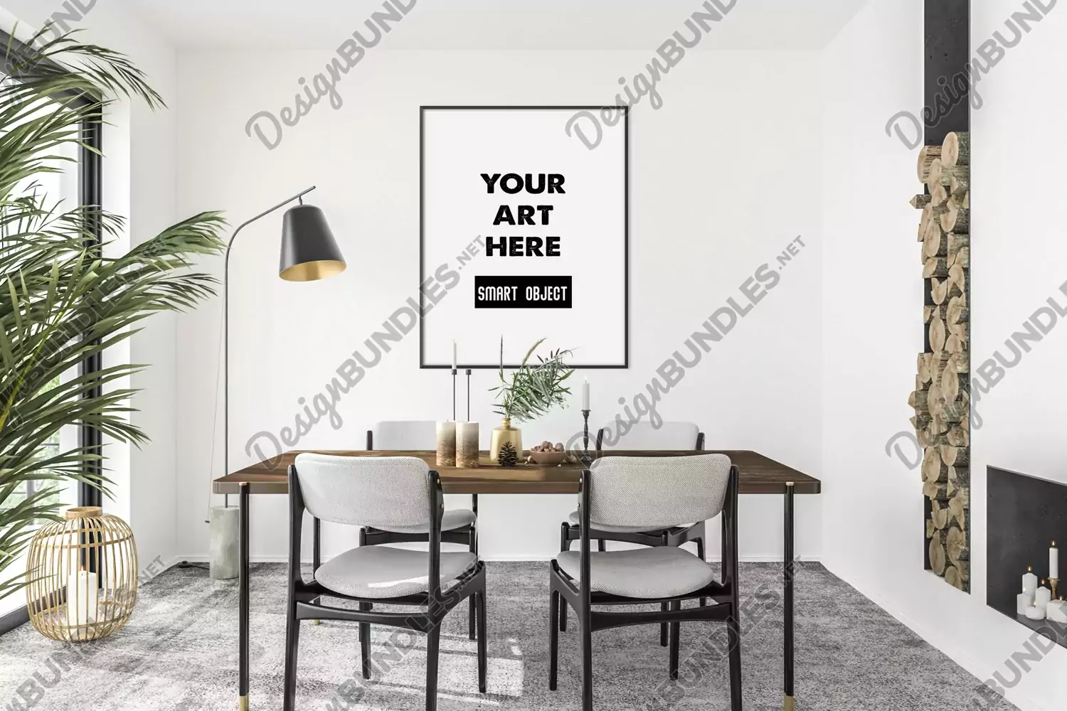 You like my interior scene but you don't use Photoshop and Photopea? No problem. This product is also for you. Use the included universal JPEG file. You can edit the JPEG file in any graphic design software working with layers. You only need to drag & drop your artwork image on the interior scene and the image adjust to your needs (resize, add inner shadows). You can use your own set of frames for this. Drag and drop the frame on the interior image - you can adjust the frame to your needs (resize as you like and add shadows).