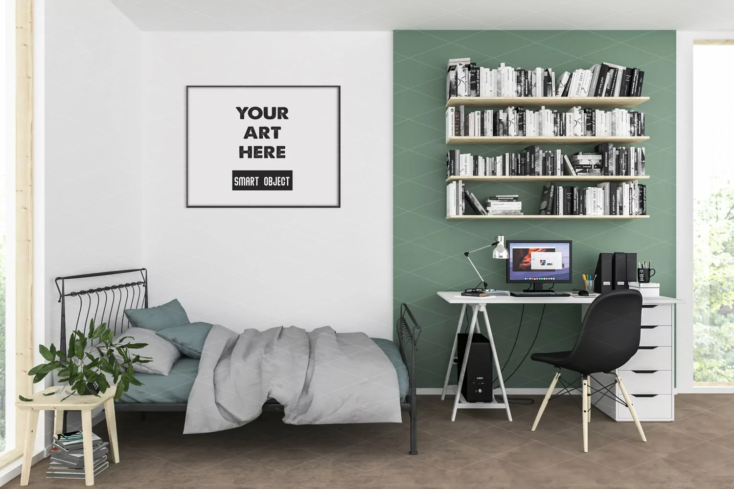 You like my interior scene but you don't use Photoshop and Photopea? No problem. This product is also for you. Use the included universal JPEG file. You can edit the JPEG file in any graphic design software working with layers. You only need to drag & drop your artwork image on the interior scene and the image adjust to your needs (resize, add inner shadows). You can use your own set of frames for this. Drag and drop the frame on the interior image - you can adjust the frame to your needs (resize as you like and add shadows).