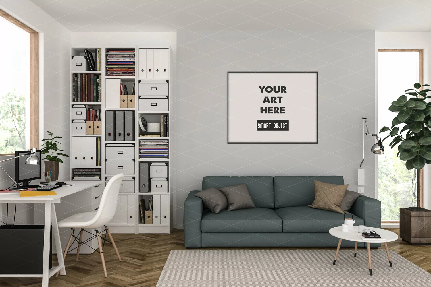 You like my interior scene but you don't use Photoshop and Photopea? No problem. This product is also for you. Use the included universal JPEG file. You can edit the JPEG file in any graphic design software working with layers. You only need to drag & drop your artwork image on the interior scene and the image adjust to your needs (resize, add inner shadows). You can use your own set of frames for this. Drag and drop the frame on the interior image - you can adjust the frame to your needs (resize as you like and add shadows).
