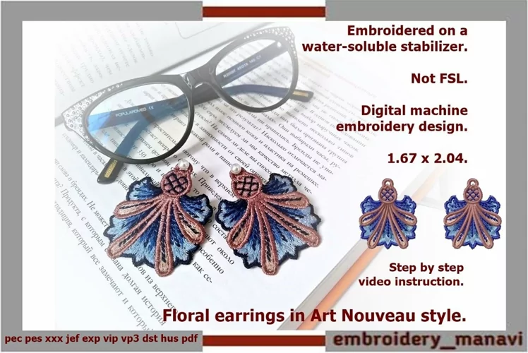 👉Floral earrings in Art Nouveau style. Embroidered on a water-soluble stabilizer. Not FSL. Step by step video instruction. Digital machine embroidery design. 1.67 x 2.04. FSL holiday, wedding, birthday jewelry earrings. A gift for girlfriend. 3D flowers and other volume objects. Small hoop. The document PDF contains video instructions for embroidery. Embroidered on a water-soluble stabilizer 2 layers. Instant download. In The Hoop embroidery project. ITH embroidery design.