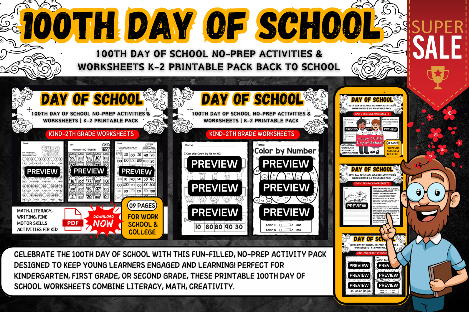 Celebrate the 100th Day of School with this fun-filled, no-prep activity pack designed to keep young learners engaged and learning! Perfect for kindergarten, first grade, or second grade, these printable 100th Day of School worksheets combine literacy, math, creativity, and movement in one easy-to-use bundle.