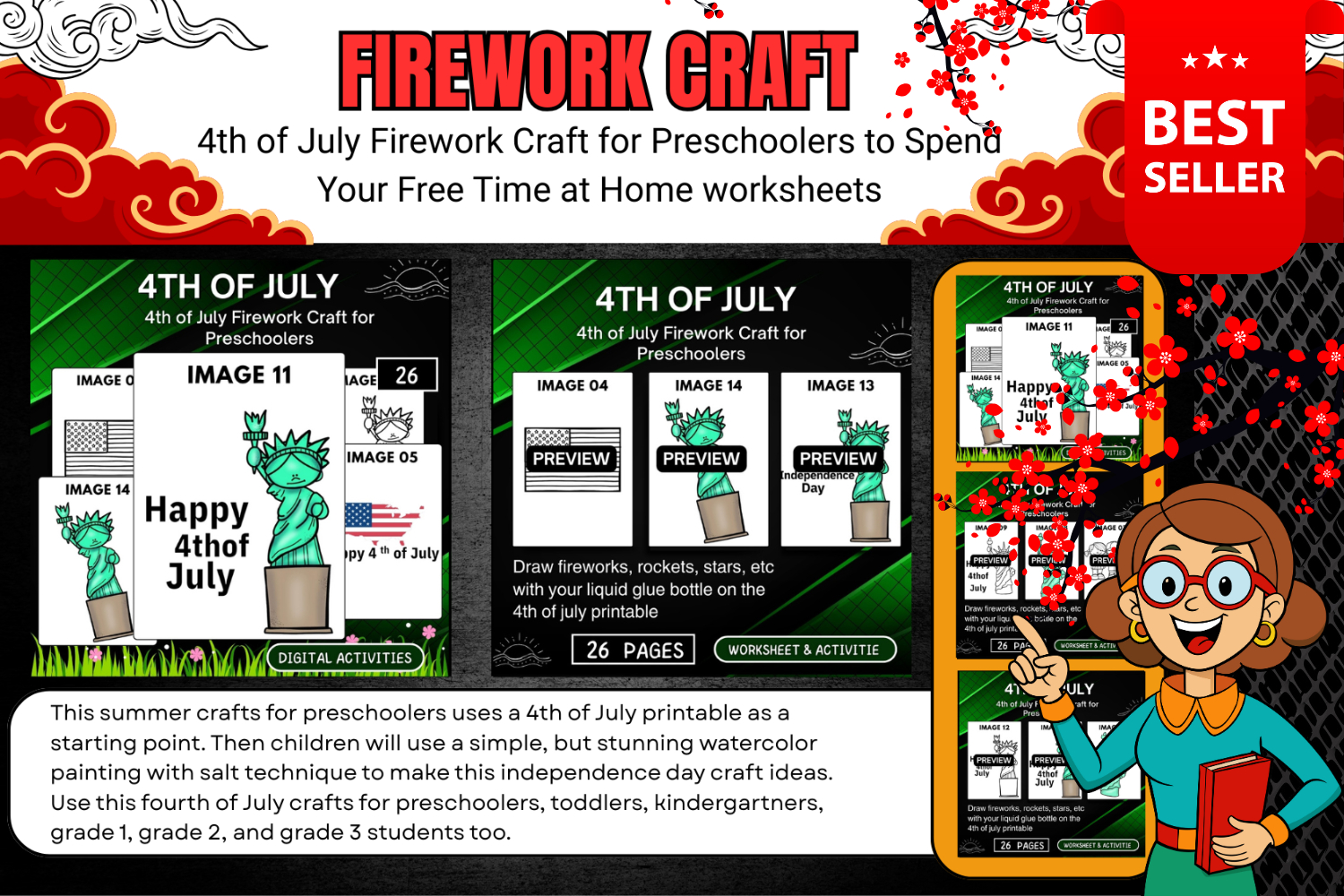Nothing celebrates summer or the 4th of July like fireworks for kids! This firework craft is a pretty fourth of July activities for preschoolers to make leading up to the big day or as they remember what the fire works looked like in the night sky. Try these fourth of July crafts with preschool, pre-k, kindergarten, first grade, 2nd grade, 3rd grade, and 4th graders too. We've provided fourth of July printable to use as a background for your 4th of July activities for preschoolers with templates including the Statue of Liberty, patriotic kids, and more!