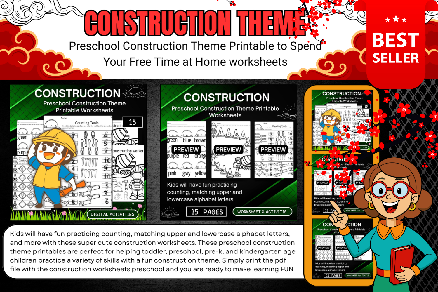 Kids will have fun practicing counting, matching upper and lowercase alphabet letters, and more with these super cute construction worksheets. These preschool construction theme printables are perfect for helping toddler, preschool, pre-k, and kindergarten age children practice a variety of skills with a fun construction theme. Simply print the pdf file with the construction worksheets preschool and you are ready to make learning FUN