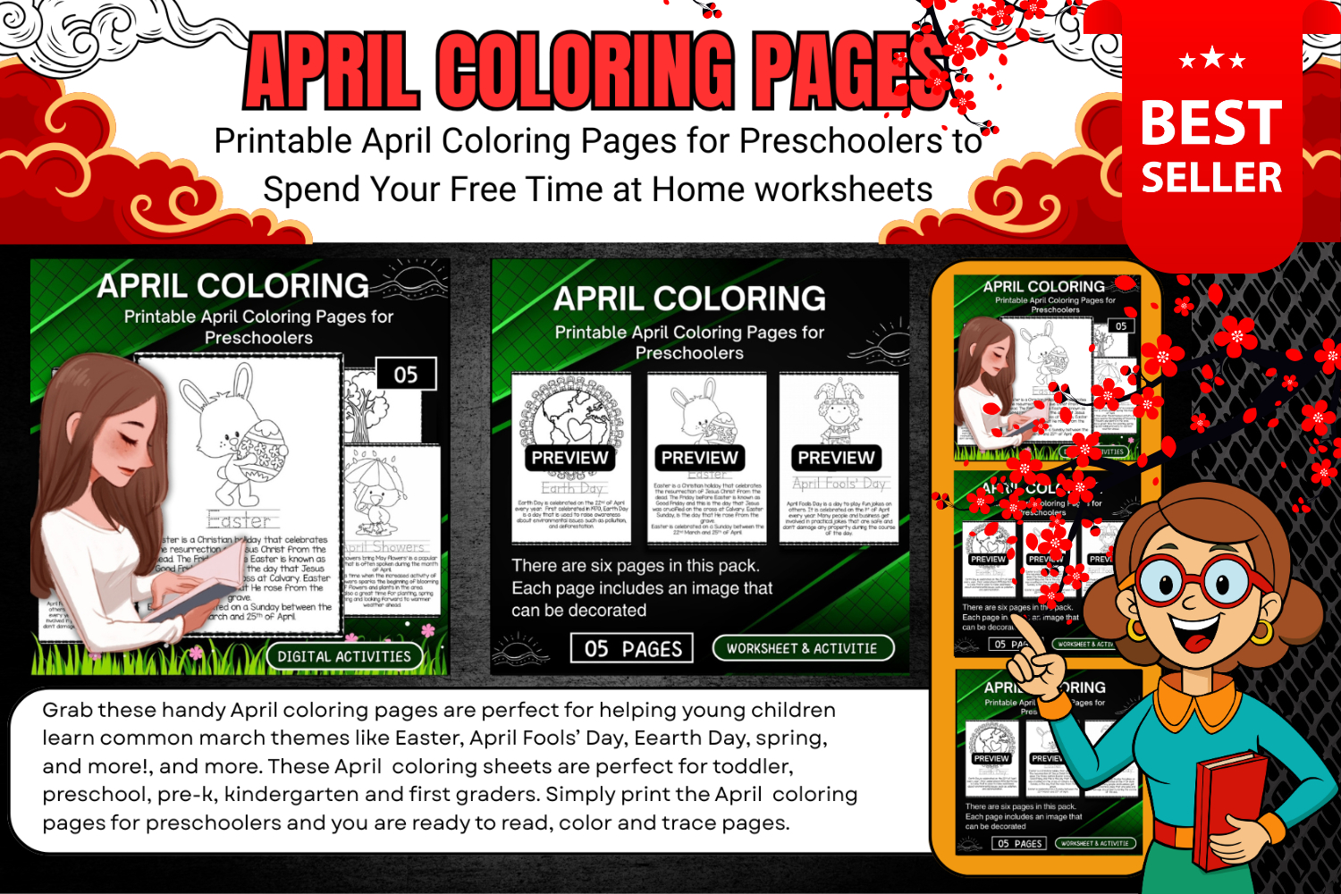 Grab these handy April coloring pages are perfect for helping young children learn common march themes like Easter, April Fools’ Day, Eearth Day, spring, and more!, and more. These April coloring sheets are perfect for toddler, preschool, pre-k, kindergarten and first graders. Simply print the April coloring pages for preschoolers and you are ready to read, color and trace pages.