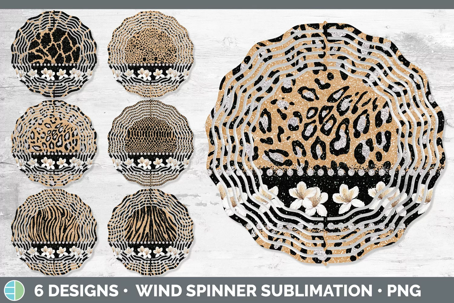 Bundle of six Tan Animal Print wind spinner sublimation designs.