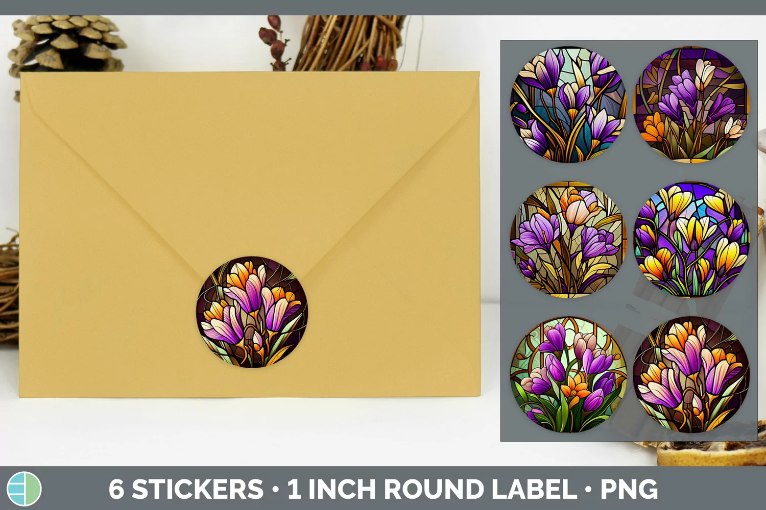 Stained Glass Crocus Flowers Stickers | Round Labels Designs