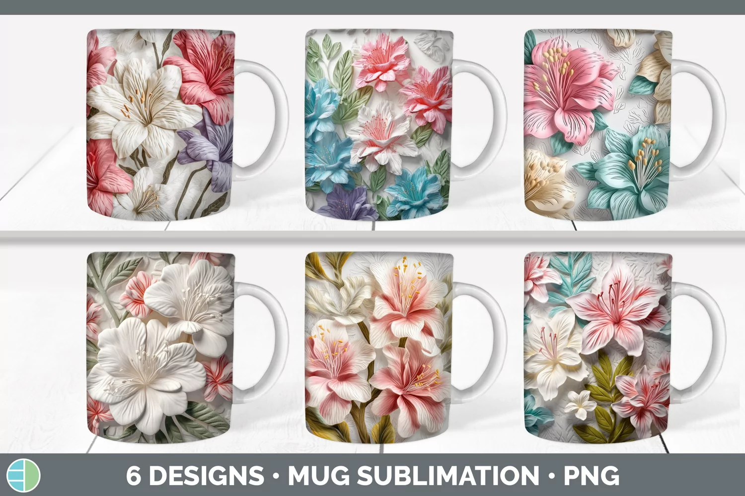 Immerse yourself in a garden of enchantment with these captivating 3D floral designs for sublimation mugs. Crafters will adore this set of 6 PNG files, which allows them to transform ordinary mugs into extraordinary works of art. Each design showcases the intricate details and vibrant colors of flowers, bringing a touch of nature's beauty to your coffee cup collection. Whether you're creating mugs for yourself, gifting them to loved ones, or selling them at craft shows, these 3D sublimation mug designs will add a touch of elegance and charm to every sip.