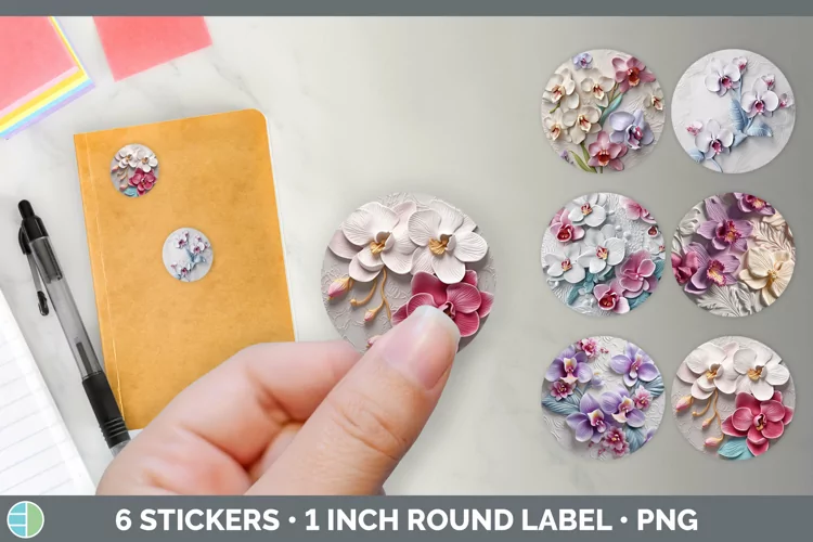 3D Orchid Flowers Stickers | Round Labels Designs Bundle