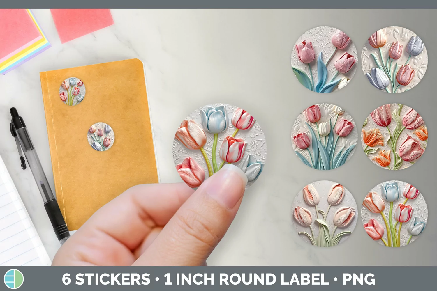 3D Tulip Flowers Stickers | Round Labels Designs Bundle