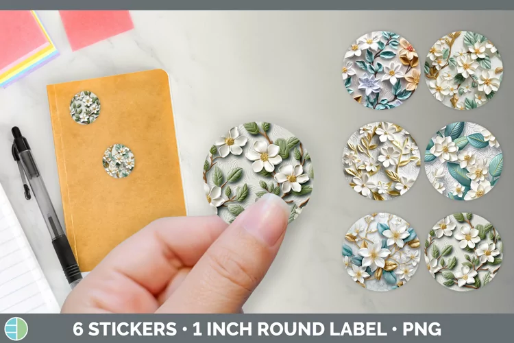 3D Jasmine Flowers Stickers | Round Labels Designs Bundle