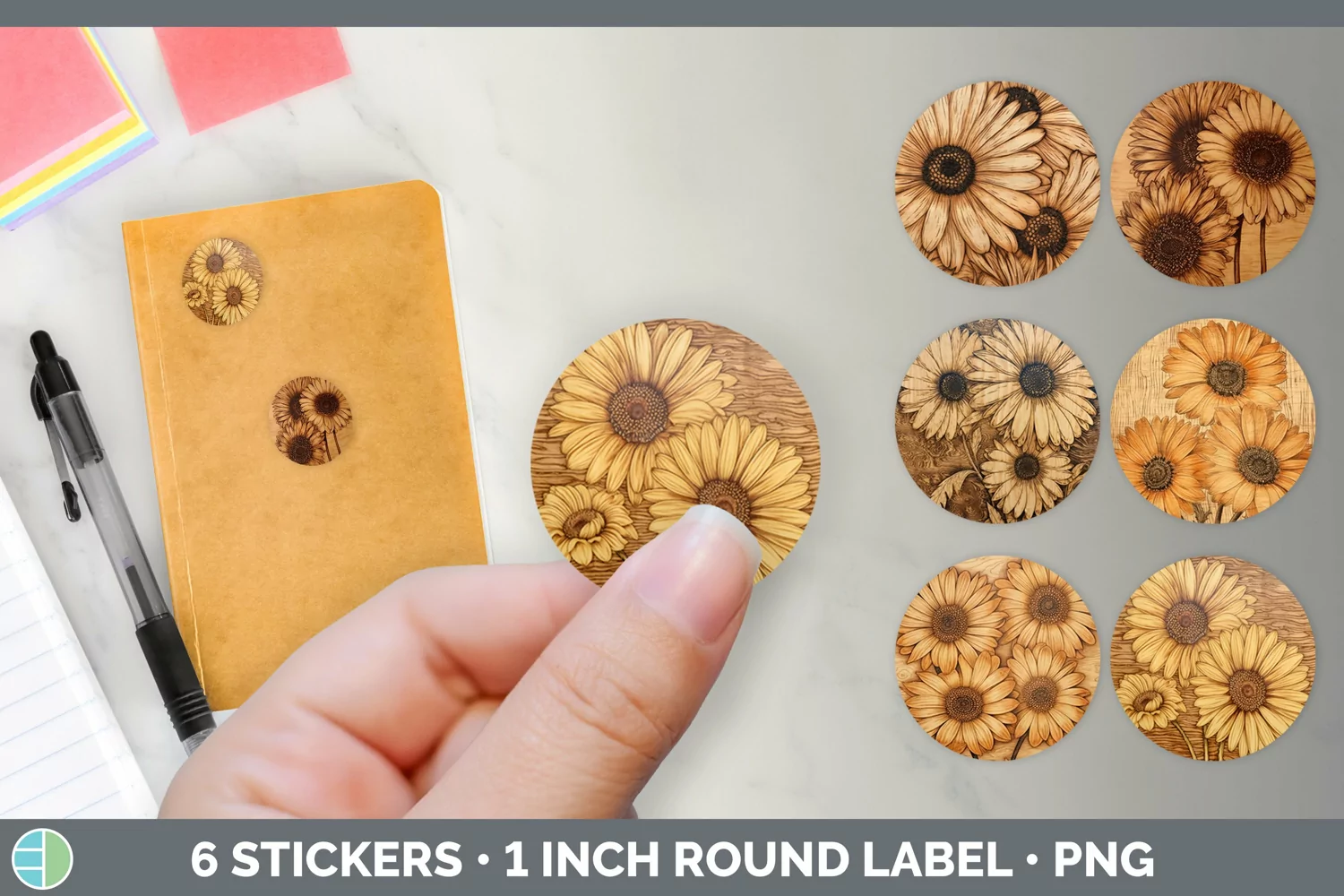 Wood Burned Gerbera Daisy Flowers Stickers | Round Labels De
