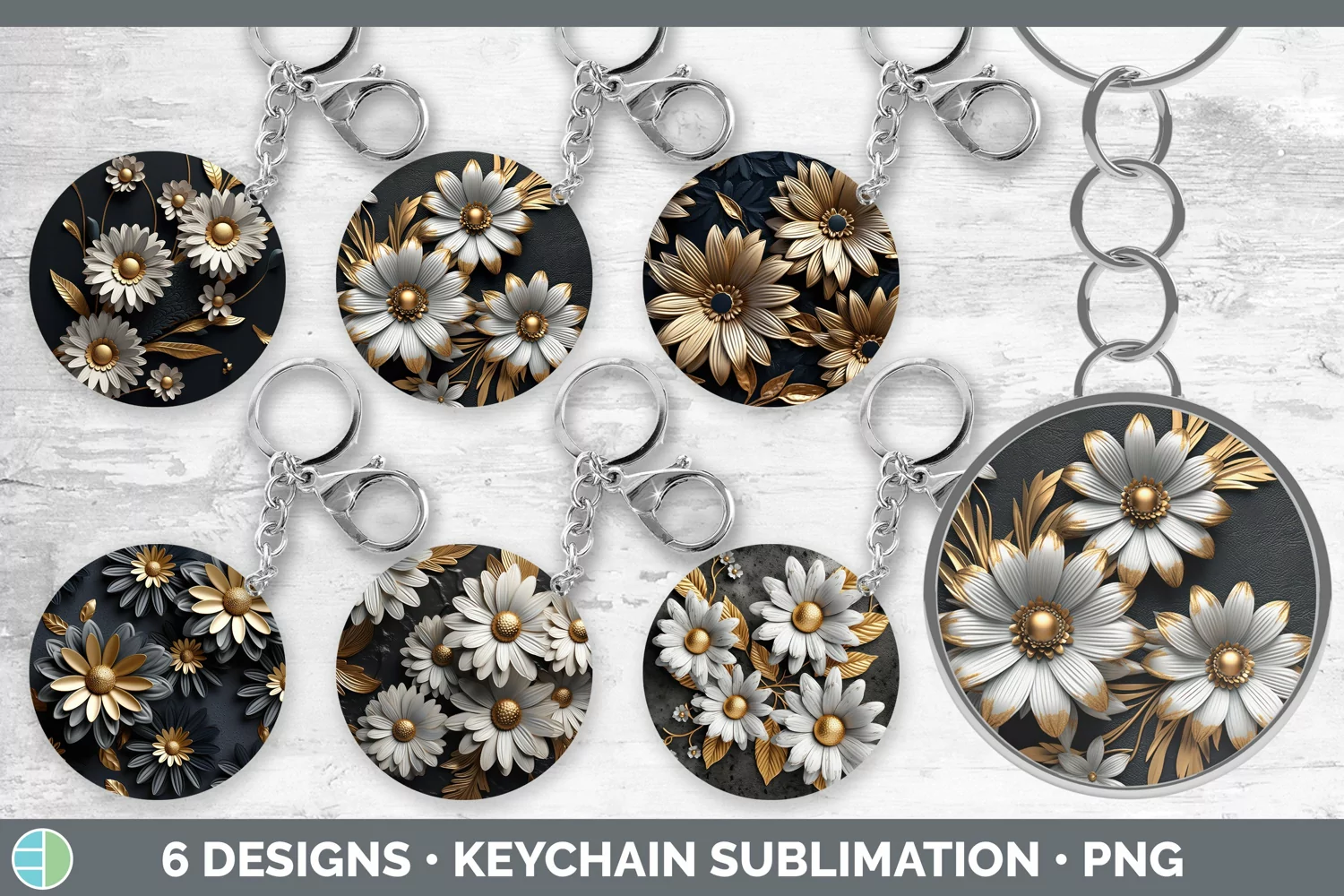 Bundle of six Black and Gold Daisys Keychain designs.