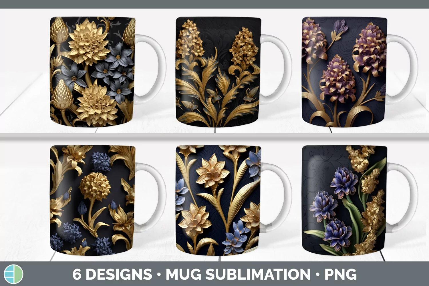 Bundle of six Black and Gold Hyacinths Mug Wrap designs.