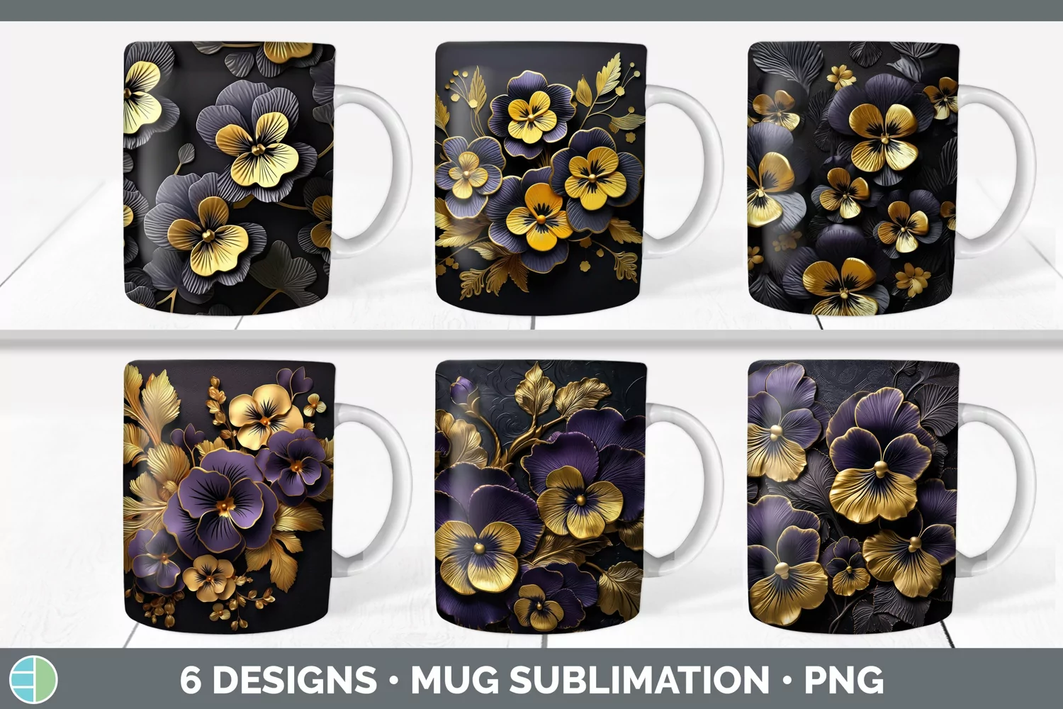Bundle of six Black and Gold Pansies Mug Wrap designs.