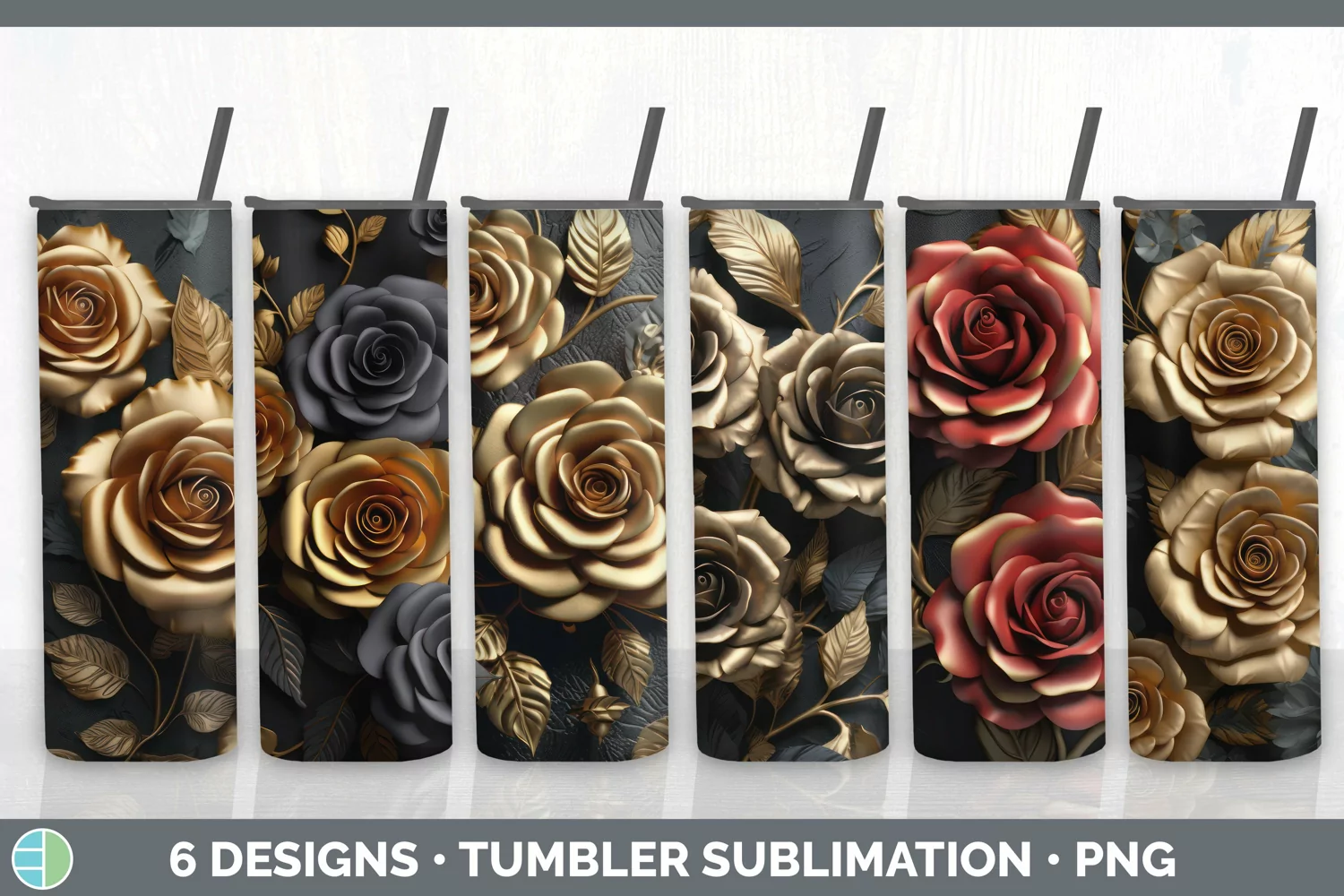 Bundle of six Black and Gold Roses Tumbler designs.