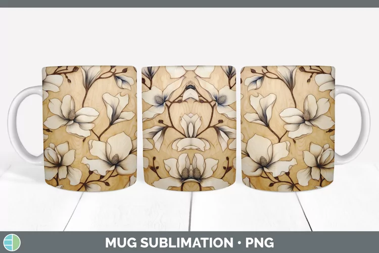 Wood Burned Magnolia Flowers Mug Wrap | Sublimation Coffee C
