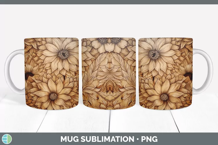 Wood Burned Dahlia Flowers Mug Wrap | Sublimation Coffee Cup