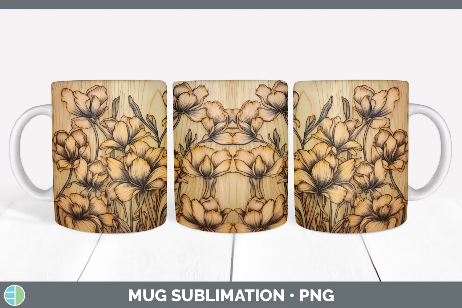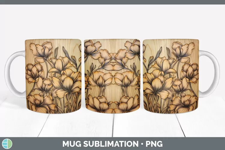 Wood Burned Freesia Flowers Mug Wrap | Sublimation Coffee Cu