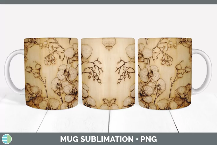 Wood Burned Orchid Flowers Mug Wrap | Sublimation Coffee Cup