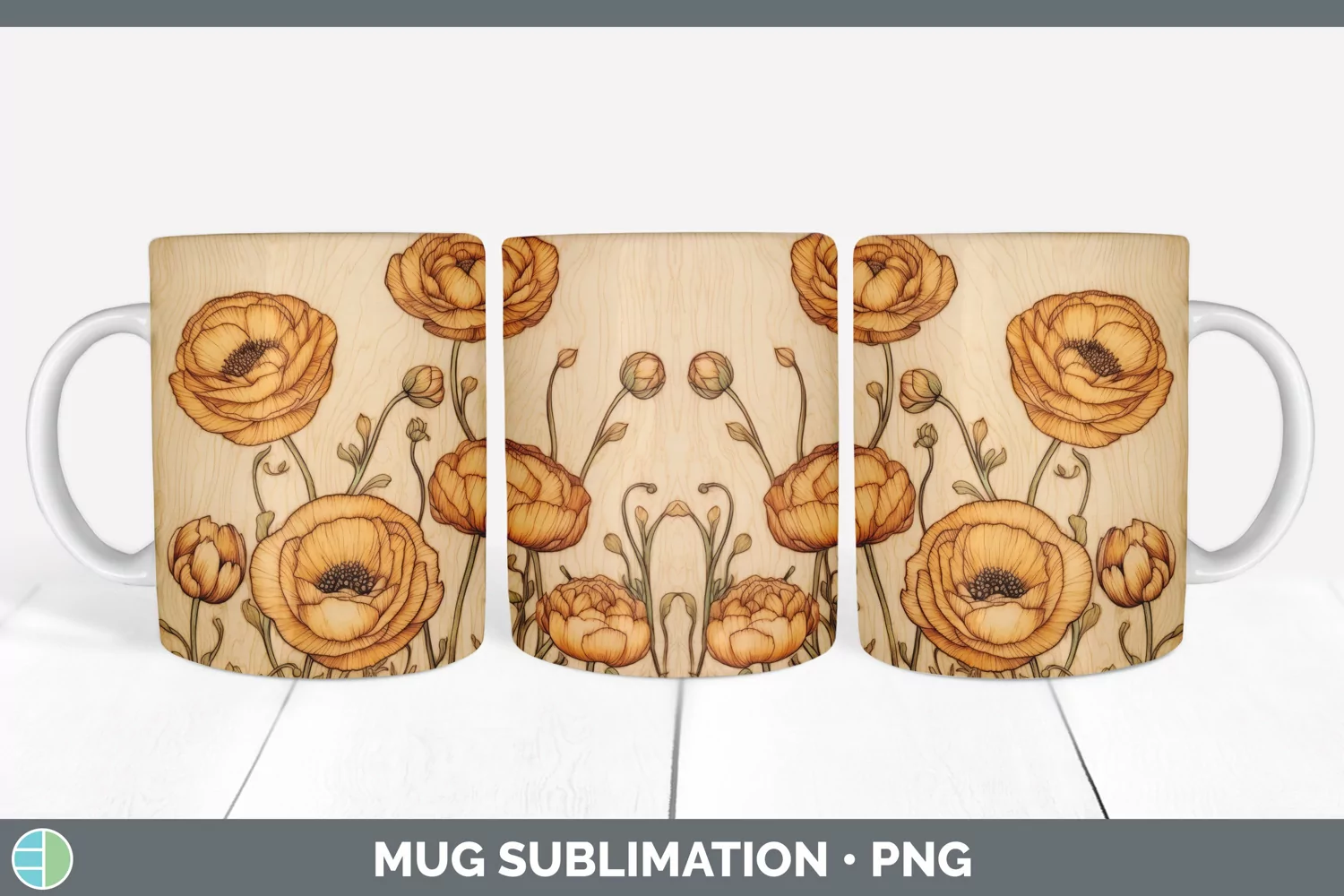 Wood Burned Ranunculus Flowers Mug Wrap | Sublimation Coffee