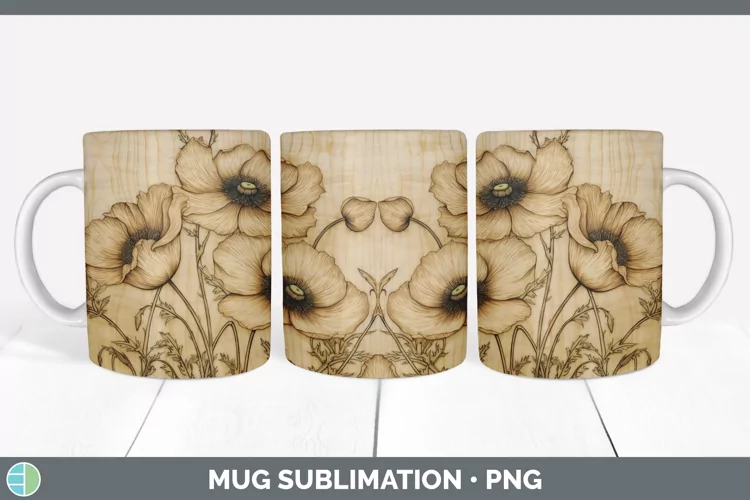 Wood Burned Anemone Flowers Mug Wrap | Sublimation Coffee Cu