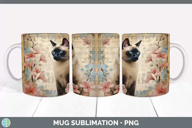 Vintage Siamese Cat Mug Wrap | Sublimation Coffee Cup Design