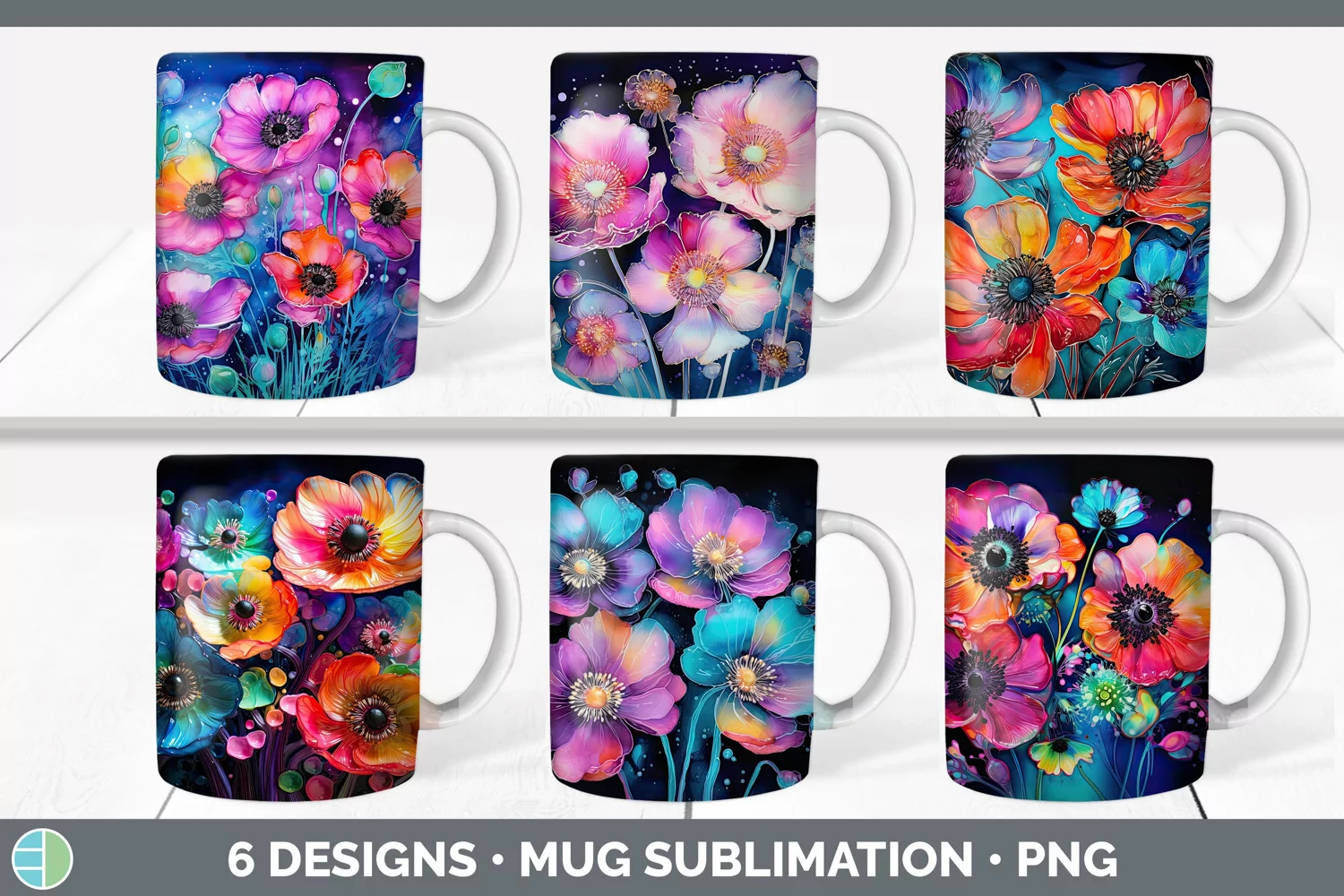 Bundle of six Alcohol Ink Anemones Mug Wrap designs.