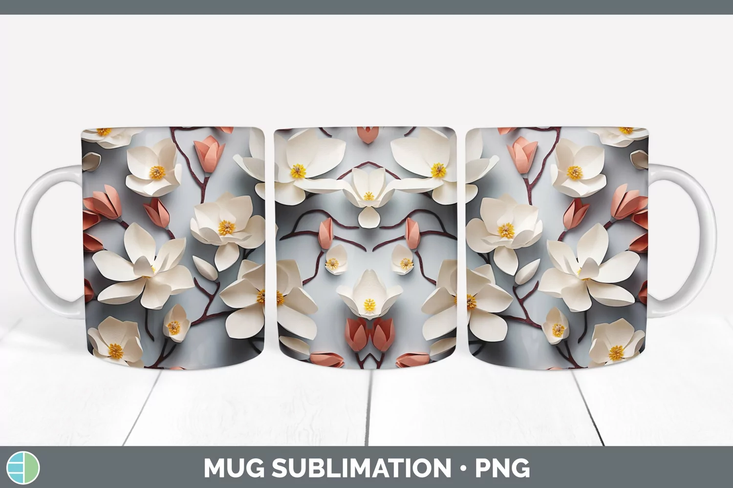 3D Paper Magnolia Flowers Mug Wrap | Sublimation Coffee Cup