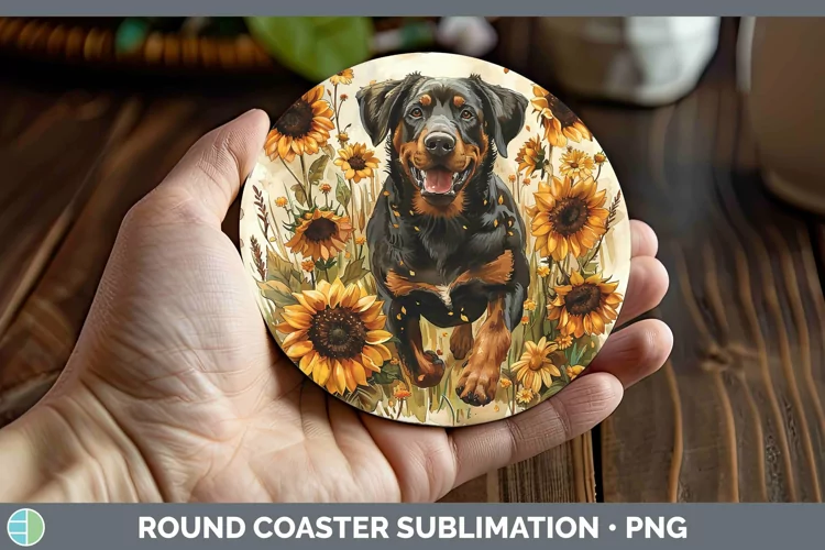 Autumn Sunflower Dog Doberman Pinscher Round Coaster Sublima