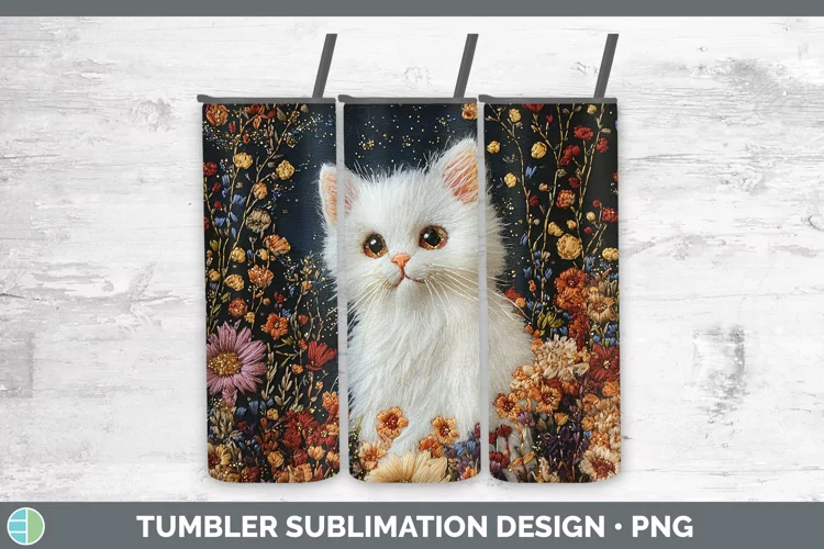 Embroidered White Cat Tumbler Sublimation 20 oz Skinny Tumbl