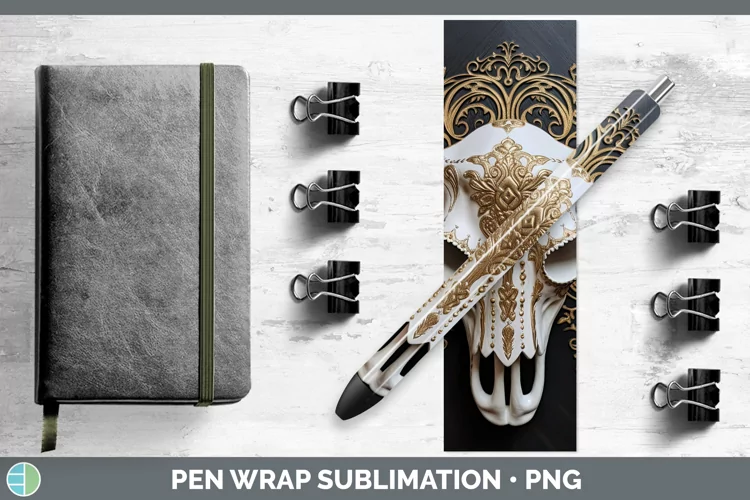 3D Black and Gold Cow Skull Pen Wrap Sublimation Pen Designs