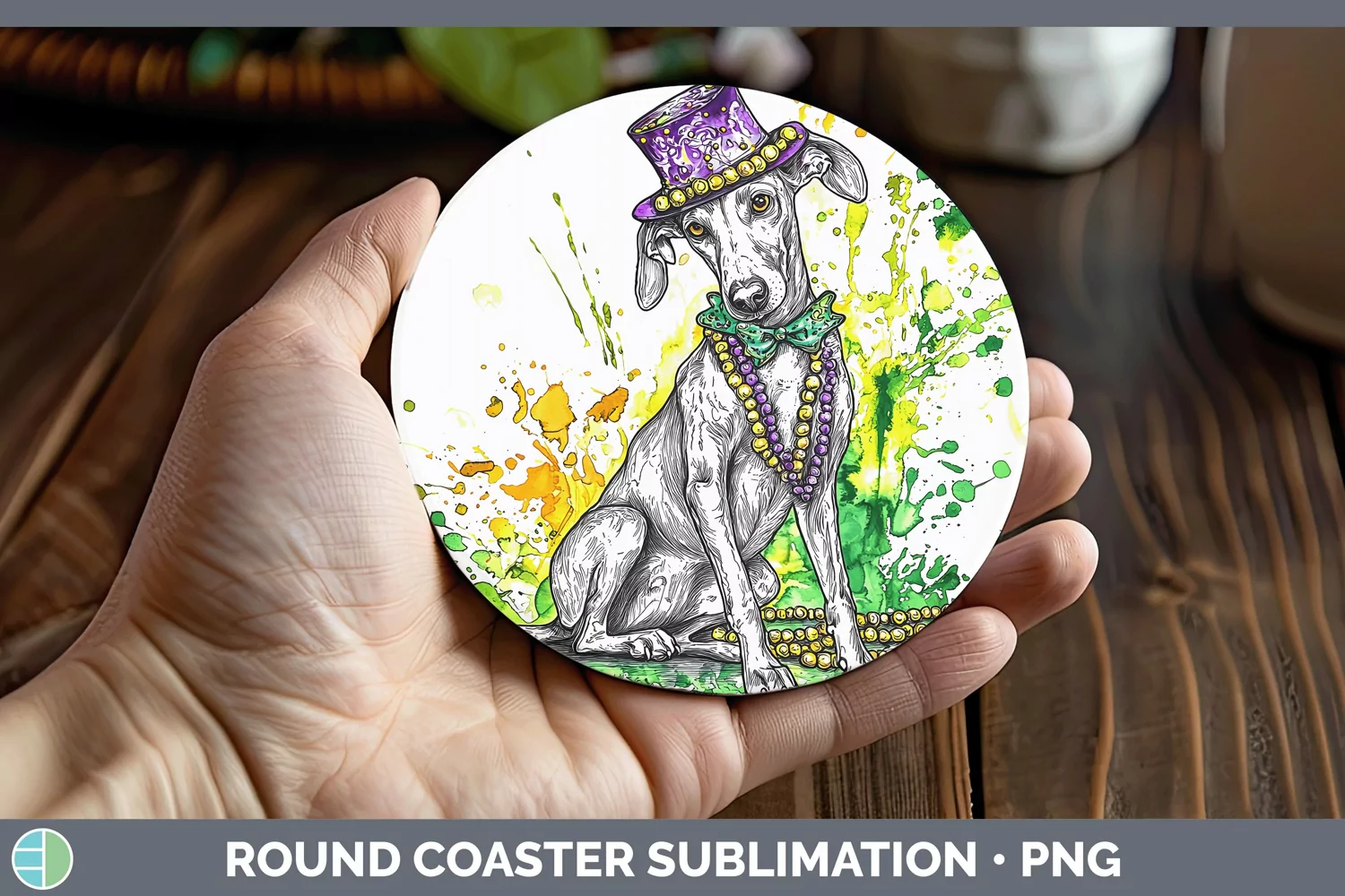 Mardi Gras Splash Dogs Greyhound Round Coaster Sublimation C