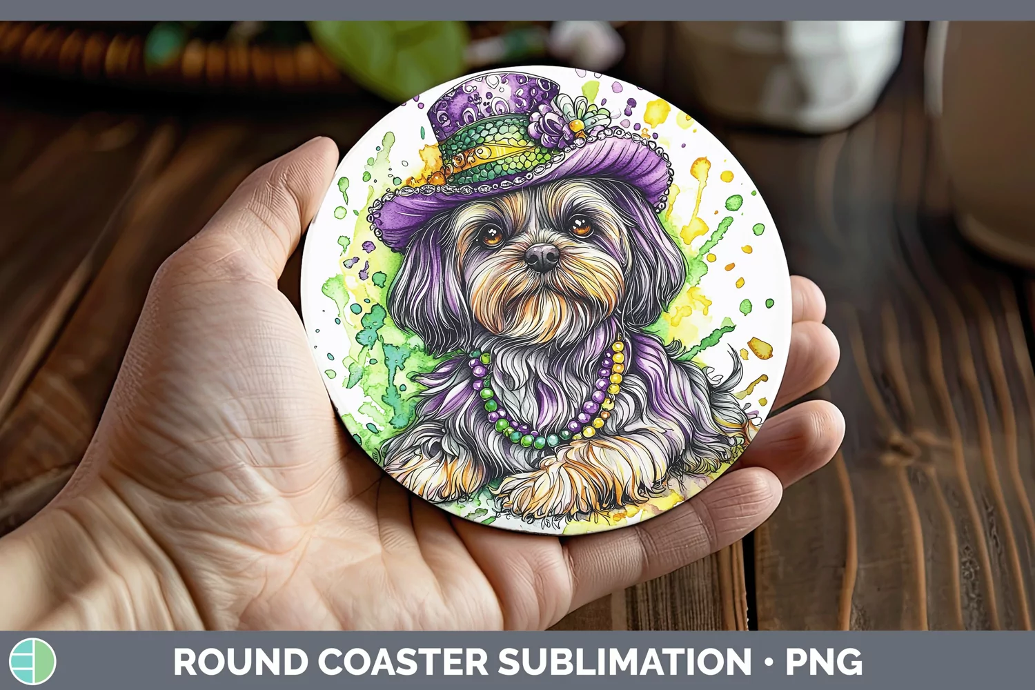 Mardi Gras Splash Dogs Lhasa Apso Round Coaster Sublimation
